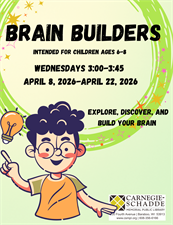 A program intended for children ages 6-8 to build, discover, and explore the world around them. Programs vary each week and more information can be found at https://calendar.csmpl.org/events/month